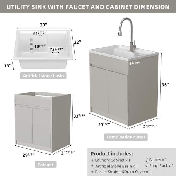 30 in. W x 22 in. D Solid Surface Drop-In Laundry/Utility Sink with Hot & Cold Water Faucet and Light Grey Cabinet