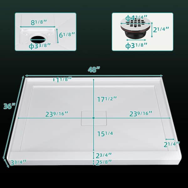 48 in. L x 36 in. W Single Threshold Alcove Shower Pan Base in White Acrylic Rectangular Shower Tray with Center Drain