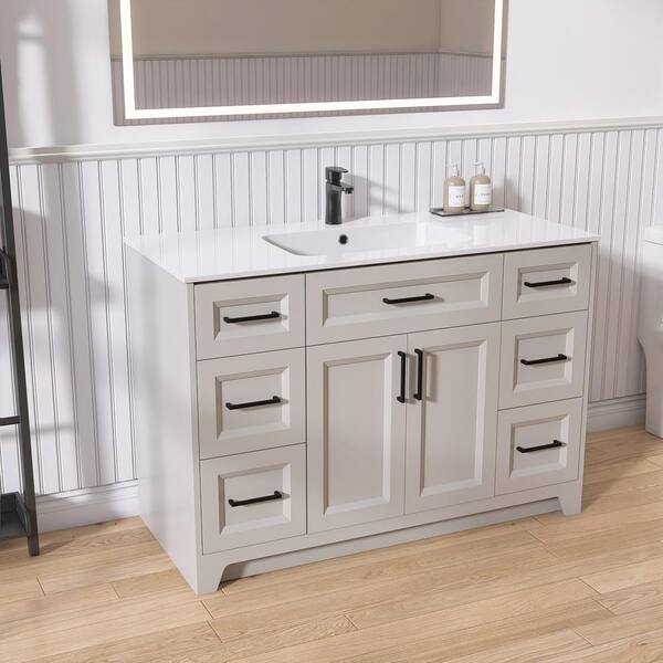48 in. W x 21.5 in. D x 34.1 in. H Freestanding Light Gray Bathroom Vanity Cabinet, Solid Surface Top with Single Basin
