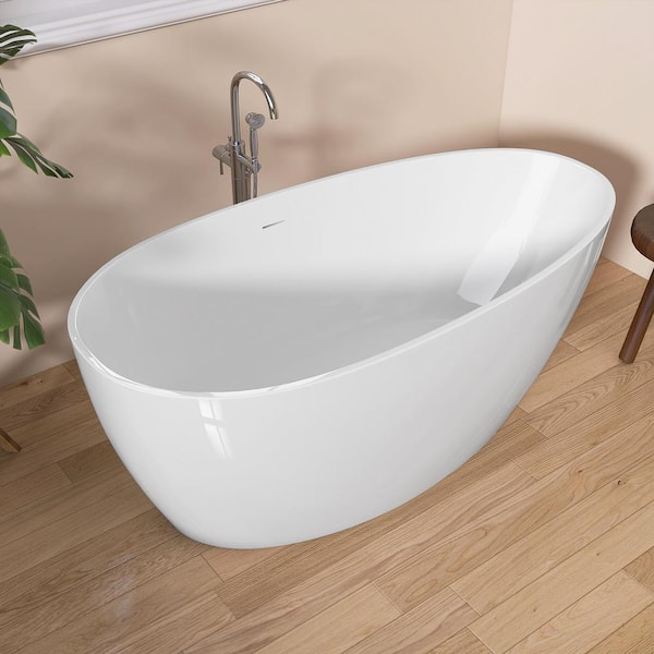 59 in. x 29.5 in Oval Acrylic Freestanding Soaking Bathtub Chrome Center Drain Flat Bottom Free Stand-Alone Tub White
