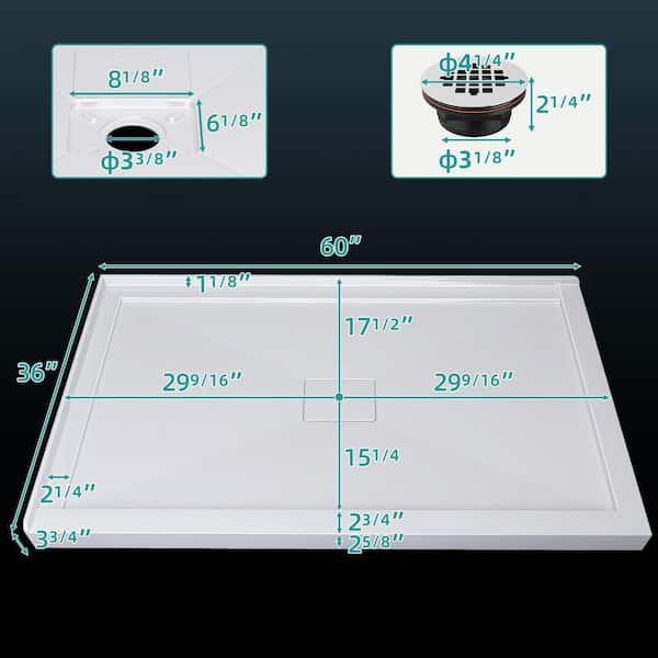 60 in. L x 36 in. W Corner Shower Pan Base in White Acrylic Shower Tray with Center Drain Hole and Magnetic Cover