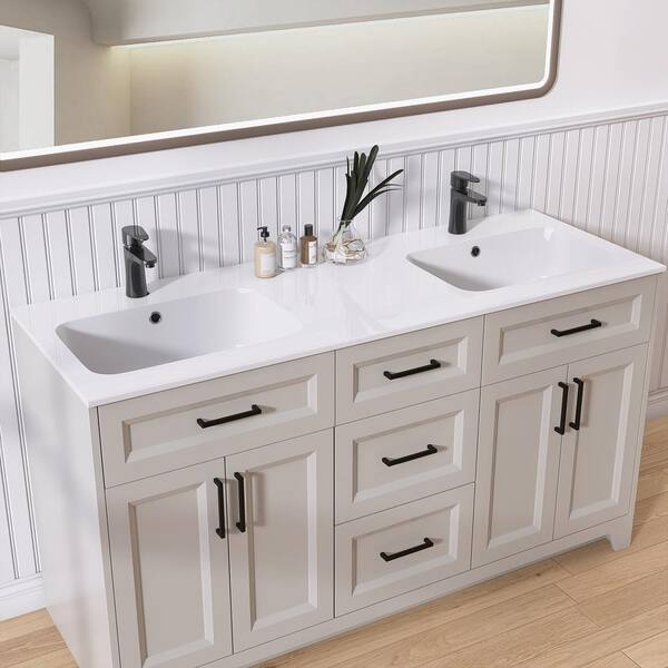 60 in. W x 21.5 in. D x 34.1 in. H Light Grey Freestanding Bath Vanity Cabinet and Solid Surface Top with Double Sink