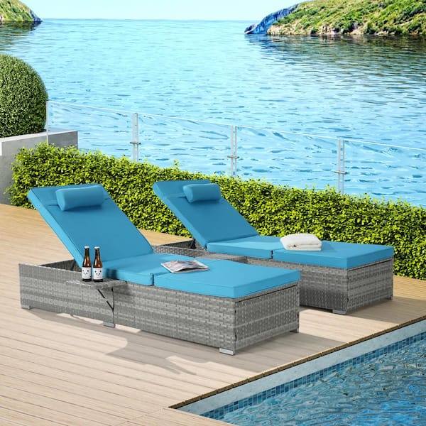 2-Piece Wicker Outdoor Patio Chaise Lounge with Tilt Adjustable Backrest and Sky Blue Cushion