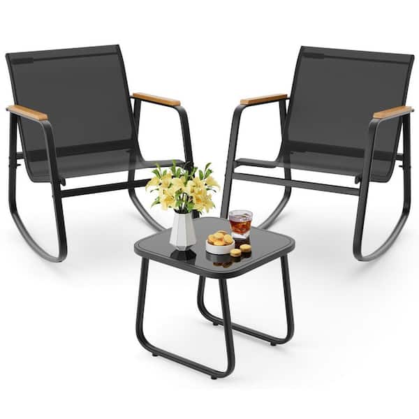 3-Piece Metal Patio Conversation Seating Set with Coffee Table, Teslin Seat Back, Armrests with Striped WPC, Black