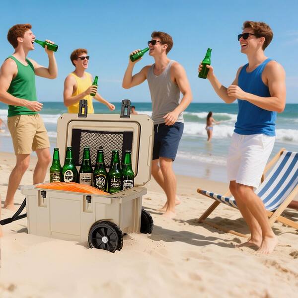 Khaki 55 qt. Portable Chest Cooler, Leak-Proof Outdoor Insulated Cooler with Handle and Wheels for Camping, Beach