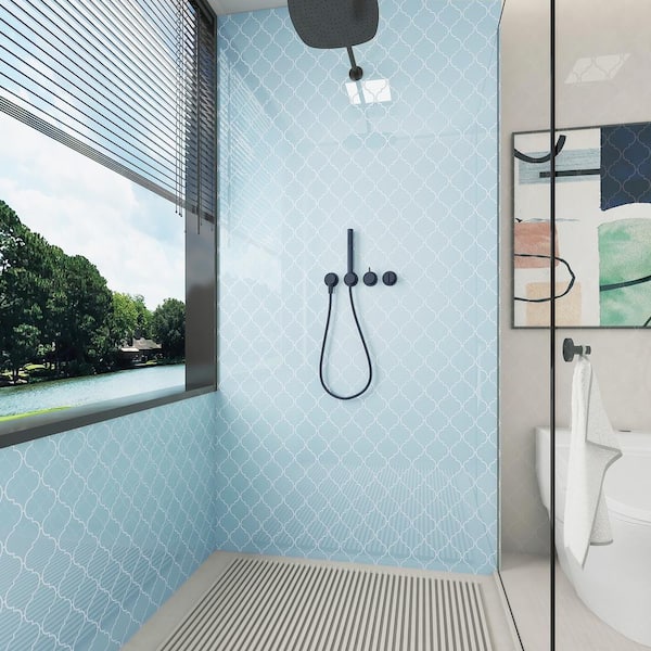 4 in. x 5 in. Classic Morning Sky Blue Glass Arabesque Backsplash and Wall Tile Sample