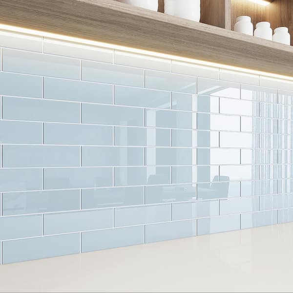 Subway Morning Sky Blue 3 in. x 9 in. Glass Tile Sample