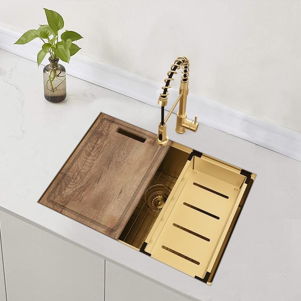 32 in. Undermount Single Bowl 18-Gauge Gold Stainless Steel Workstation Kitchen Sink with Spring Neck Faucet