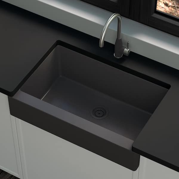 Stonehaven 33 in. Farmhouse Black Onyx Granite Composite Single Bowl Apron Front Kitchen Sink with Black Onyx Strainer
