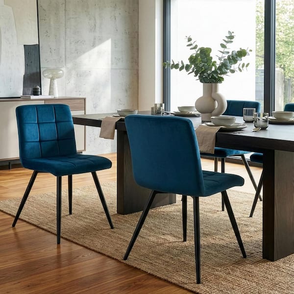 Set of 2 Anika Blue Velvet Dining Chair Side Chair with Stitching and Black Metal Legs