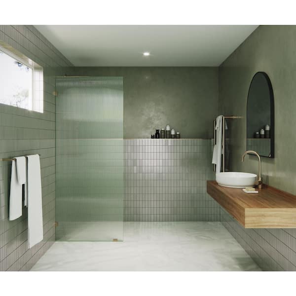 30 in. W x 78 in. H Fixed Single Panel Frameless Shower Door in Brushed Bronze with Fluted Frosted Glass
