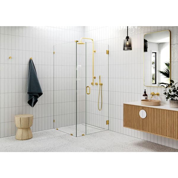35 in. W x 36 in. D x 78 in. H Pivot Frameless Corner Shower Enclosure in Satin Brass Finish with Clear Glass