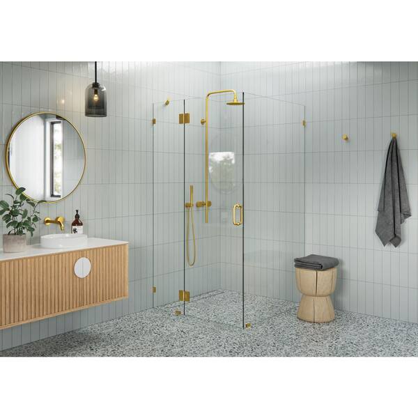 43 in. W x 38 in. D x 78 in. H Pivot Frameless Corner Shower Enclosure in Satin Brass Finish with Clear Glass