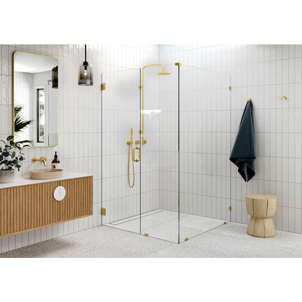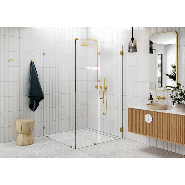 46 in. W x 46.5 in. D x 78 in. H Pivot Frameless Corner Shower Enclosure in Satin Brass Finish with Clear Glass