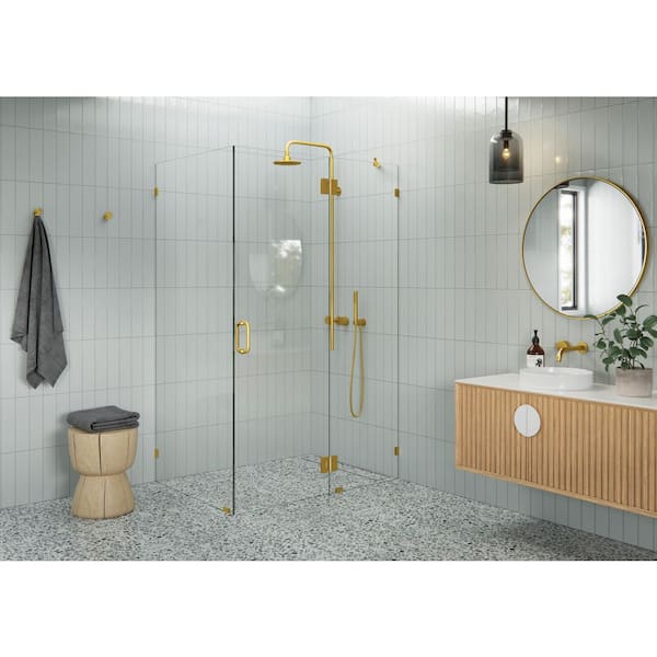 49 in. W x 35 in. D x 78 in. H Pivot Frameless Corner Shower Enclosure in Satin Brass Finish with Clear Glass