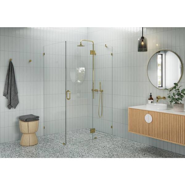 50 in. W x 39 in. D x 78 in. H Pivot Frameless Corner Shower Enclosure in Polished Brass Finish with Clear Glass