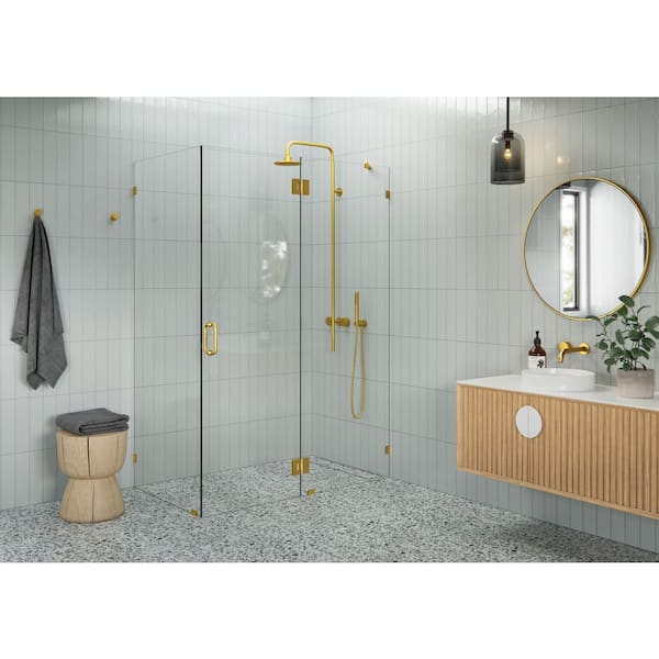 54 in. W x 33 in. D x 78 in. H Pivot Frameless Corner Shower Enclosure in Satin Brass Finish with Clear Glass
