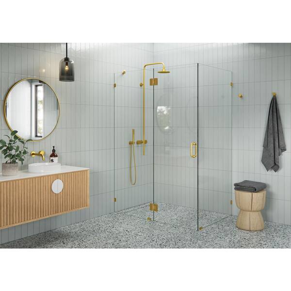 54 in. W x 38 in. D x 78 in. H Pivot Frameless Corner Shower Enclosure in Satin Brass Finish with Clear Glass