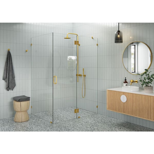 54 in. W x 42 in. D x 78 in. H Pivot Frameless Corner Shower Enclosure in Satin Brass Finish with Clear Glass