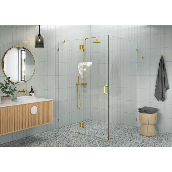 54 in. W x 48 in. D x 78 in. H Pivot Frameless Corner Shower Enclosure in Satin Brass Finish with Clear Glass