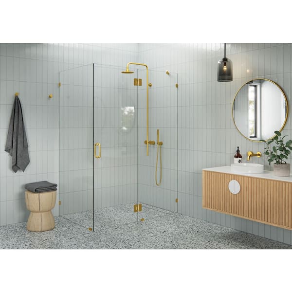 55 in. W x 35 in. D x 78 in. H Pivot Frameless Corner Shower Enclosure in Satin Brass Finish with Clear Glass