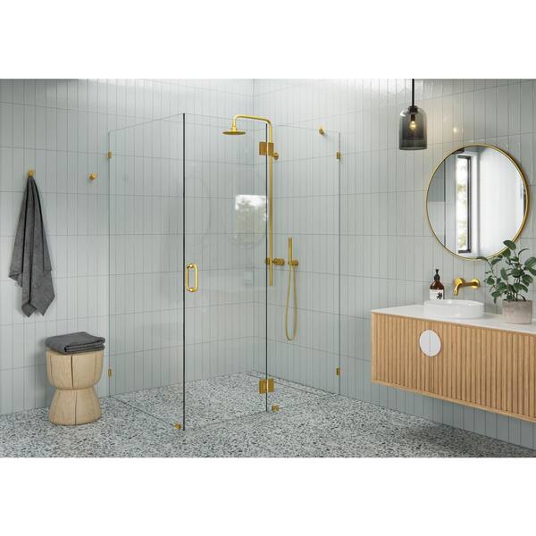 55 in. W x 39 in. D x 78 in. H Pivot Frameless Corner Shower Enclosure in Satin Brass Finish with Clear Glass