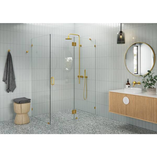 56 in. W x 35 in. D x 78 in. H Pivot Frameless Corner Shower Enclosure in Satin Brass Finish with Clear Glass