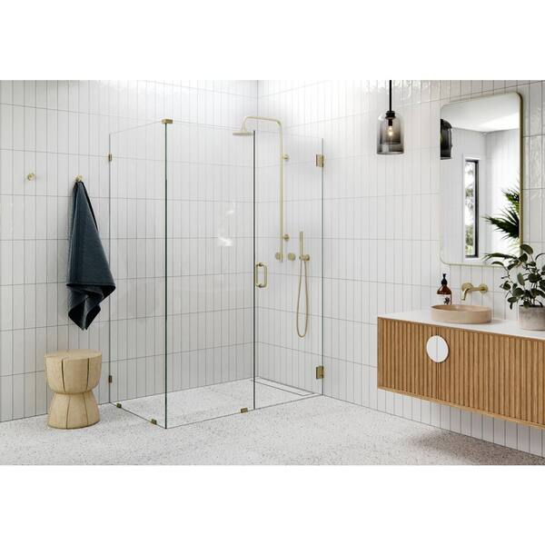 57 in. W x 34 in. D x 78 in. H Pivot Frameless Corner Shower Enclosure in Satin Brass Finish with Clear Glass