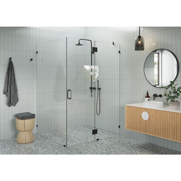 57 in. W x 46 in. D x 78 in. H Pivot Frameless Corner Shower Enclosure in Matte Black Finish with Clear Glass