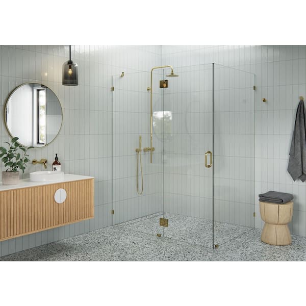 58 in. W x 40 in. D x 78 in. H Pivot Frameless Corner Shower Enclosure in Polished Brass Finish with Clear Glass