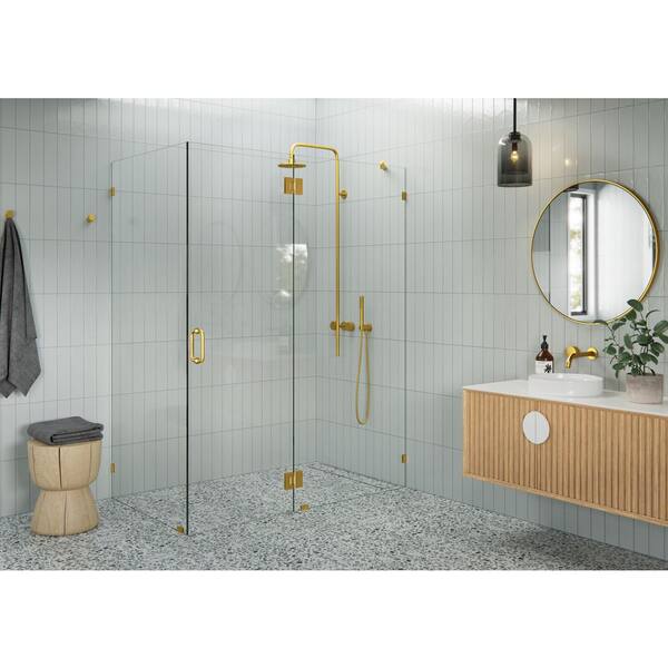 59 in. W x 34 in. D x 78 in. H Pivot Frameless Corner Shower Enclosure in Satin Brass Finish with Clear Glass