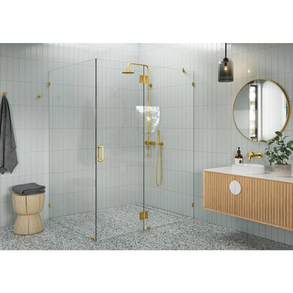 59 in. W x 46 in. D x 78 in. H Pivot Frameless Corner Shower Enclosure in Satin Brass Finish with Clear Glass