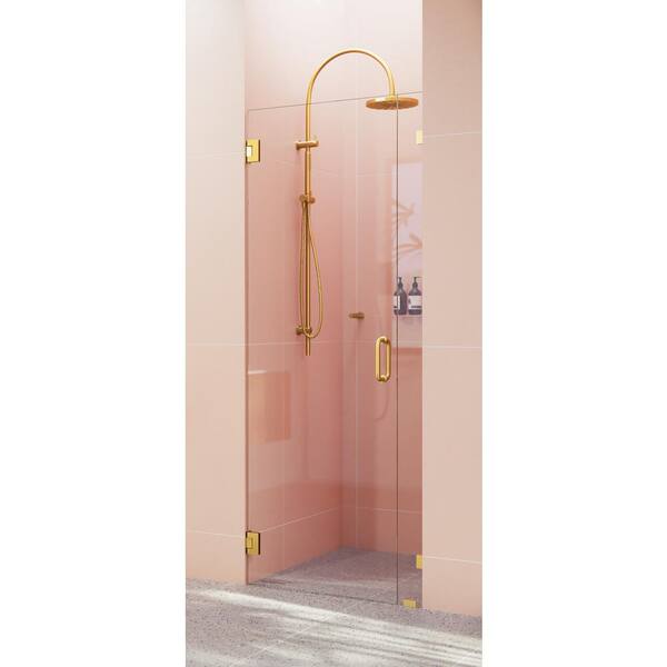 Illume 31.25 in. W x 78 in. H Wall Hinged Frameless Shower Door in Satin Brass Finish with Clear Glass