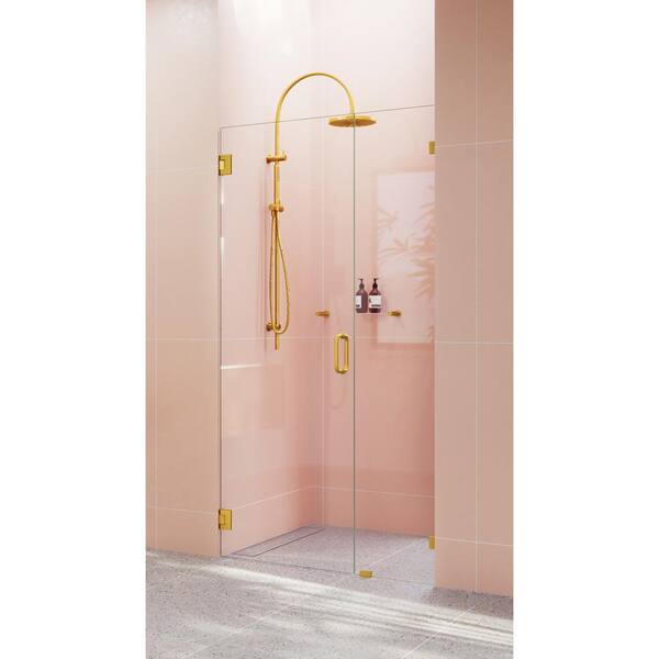 Illume 44.5 in. W x 78 in. H Wall Hinged Frameless Shower Door in Satin Brass Finish with Clear Glass