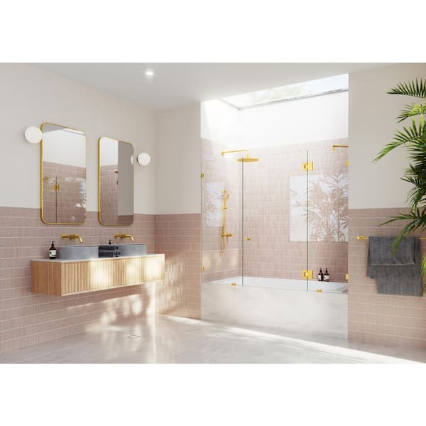 Stellar 73 in. W x 58.25 in. H Glass Hinged Frameless 3-Panel Inline Tub Door in Satin Brass with Clear Glass