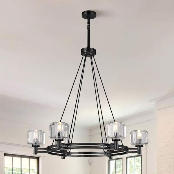 36 in. 6-Light Black Farmhouse Wagon Wheel Chandelier with Crystal Lampshade for Dining Room, Living Room Kitchen Island