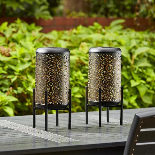 14.25 in. H Black and Gold Metal Cutout Flower Pattern Solar Powered LED Outdoor Lantern with Stand (set of 2)