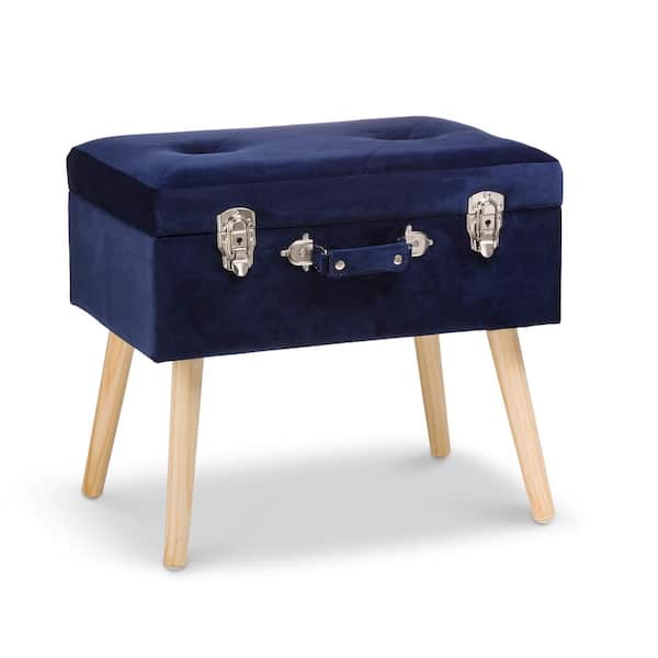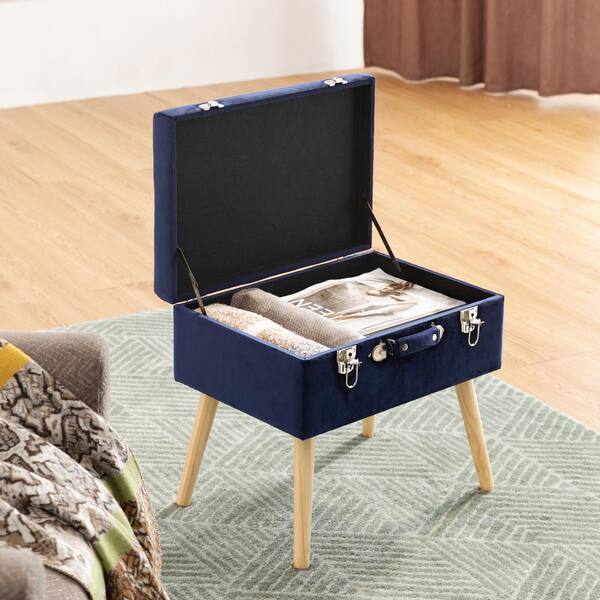19.70 in. L Navy Blue Velvet Upholstered Storage Stool with Natural Solid Rubberwood Legs