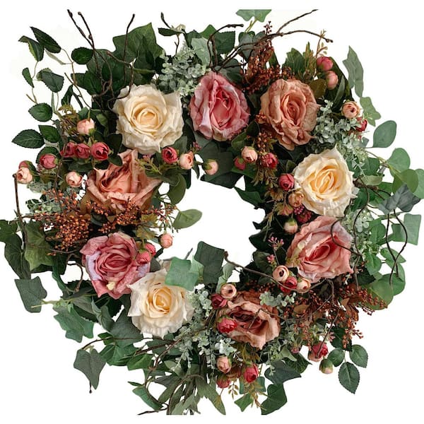 26 in. Unlit Green Artificial Wreath with Roses