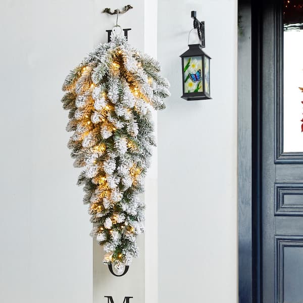 3 ft. L Pre-Lit Flocked Christmas Teardrop, with 50 Warm White LED Lights and Timer, Three Function