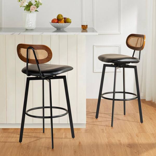 30 in. Seat Height Modern Black Leatherette Swivel Bar Stool with Metal Frame, Walnut Faux Rattan Backrest Set of 4
