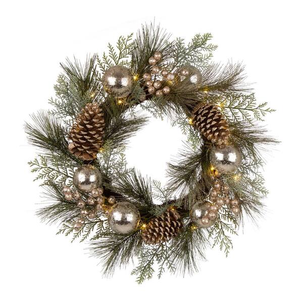 7 in. Wooden Window Frame with LED Pre-Lit Pinecone and Ornament Wreath