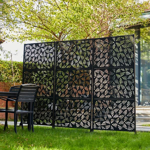 71.50 in. H Black Galvanized Steel Irregular Geometric Pattern Privacy Screen Fence Panel Room Divider with Riser Feet