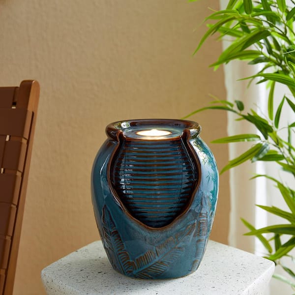 9.25 in. H Turquoise Leaf Textured Ceramic Jar Tabletop or Water Floor Fountain with Pump and LED light