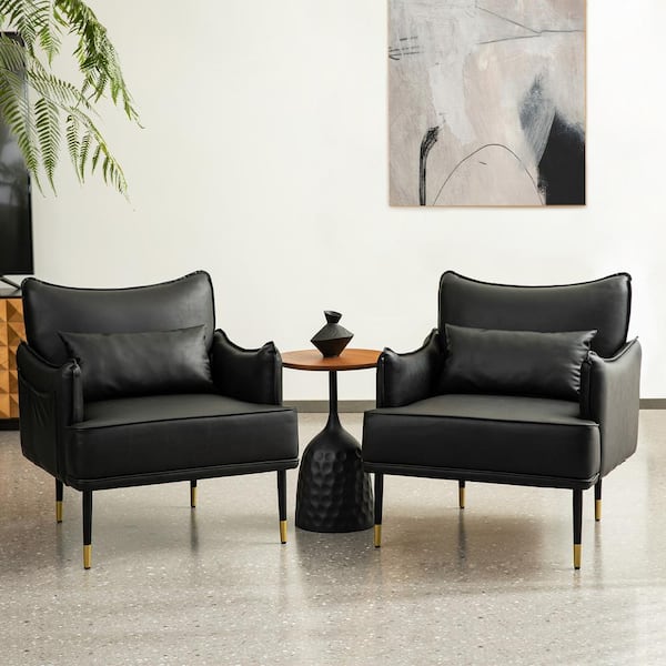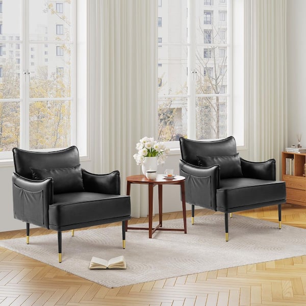(Set of 2) Mid-Century Modern Black Leatherette Armchair With Gold Trimmed Metal Legs and Side Pocket