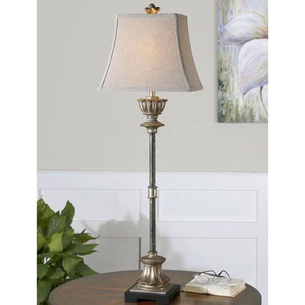 • Lamp is crafted in a candlestick shape in hues of antique silver