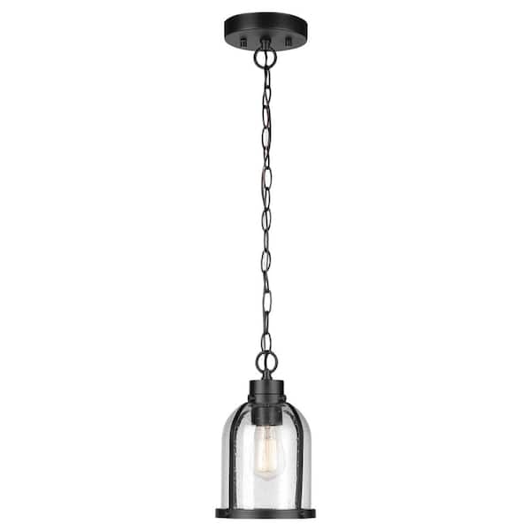 1-Light Matte Black Outdoor Indoor Pendant Light with Clear Seeded Glass Shade, Vintage Incandescent Bulb Included