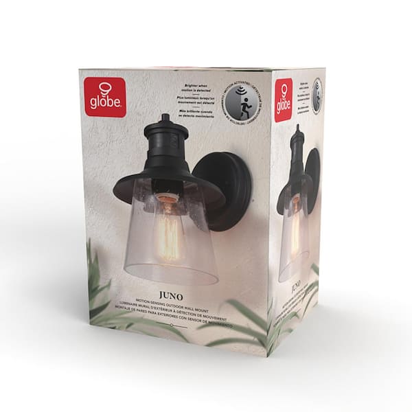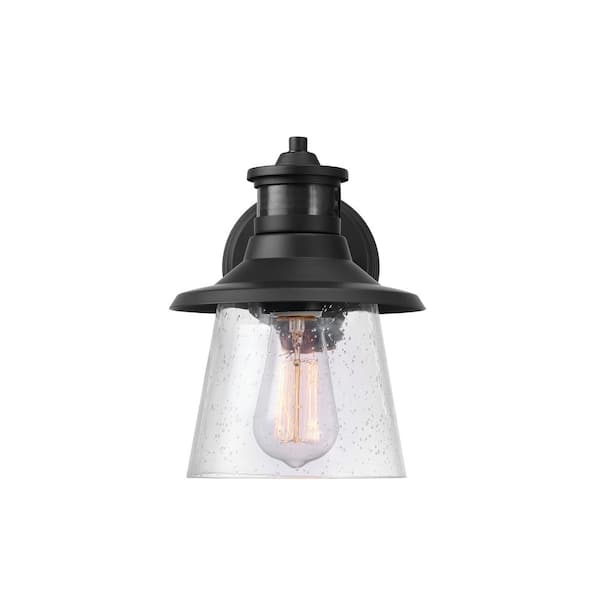 150-Degree 1-Light Matte Black Motion Activated Outdoor Barn Wall Sconce with Clear Seeded Glass Shade