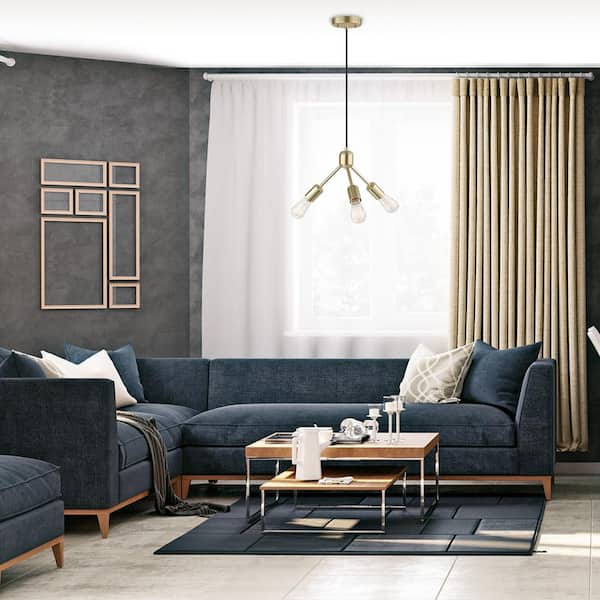 • Gold chandelier with exposed bulbs and matte black cord