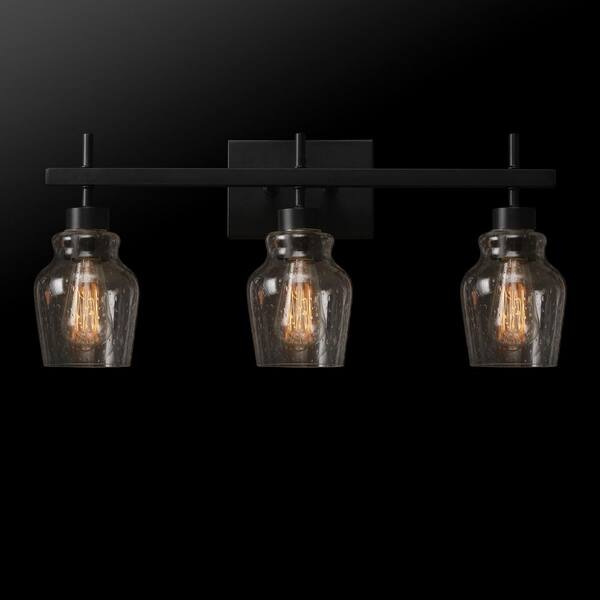 Bunbury 24 in. 3-Light Matte Black Vanity Light with Seeded Glass Shades, 4-Piece Bathroom Accessory Set Included